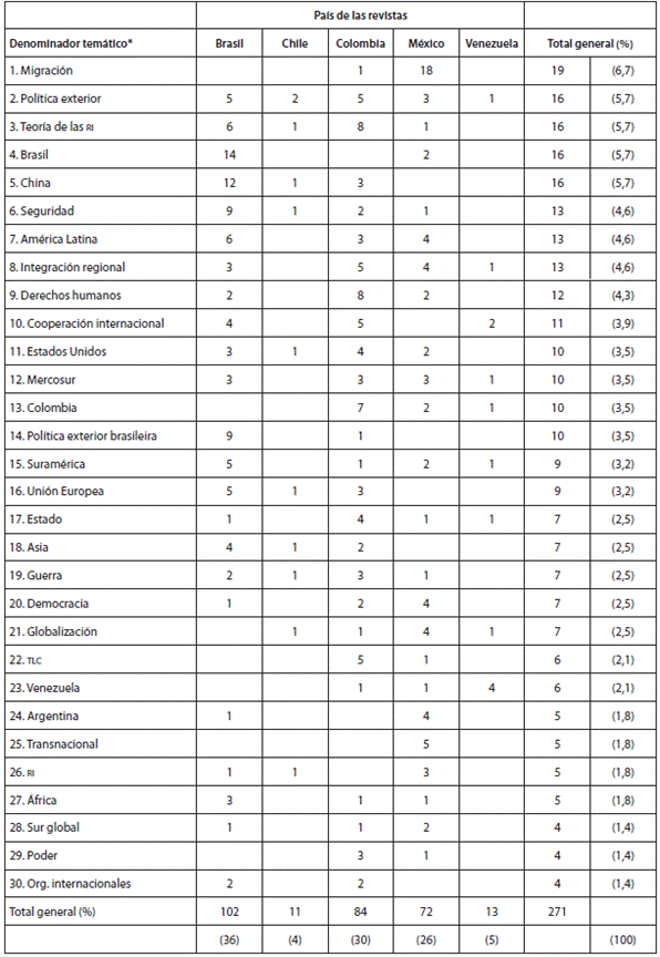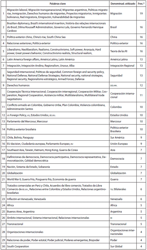 Para una mirada sobre las temáticas de las publicaciones se revisaron las palabras clave de los distintos artículos, observándose un total de 7157. Se logró agrupar a 282 en 30 denominadores temáticos para un total de 418 (tabla 4). Las agrupaciones responden al establecimiento de relaciones según un orden geoespacial (Brasil, China, América Latina, Colombia, Estados Unidos, Suramérica, Unión Europea, Asia, Venezuela, África y Argentina), conceptos afines (Migración, Política Exterior, Teoría de las RI, Integración Regional, Seguridad, Cooperación Internacional, Mercosur, Democracia, Estado, Guerra, TLC Bilaterales, RI y Poder) o la constitución de conceptos clave por sí mismos (Sur global, organizaciones internacionales, globalización, derechos humanos, política exterior brasileña, transnacional). Los 388 denominadores restantes poseen una frecuencia menor de tres y no logran constituirse como denominadores clave.