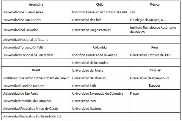 Para el presente apartado el análisis es construido a partir de la identificación de algunos de los principales departamentos de Ciencia Política y Relaciones Internacionales de la región. Utilizamos como punto de partida la selección realizada por Altman (2011) en su preocupación por descifrar el aporte de diferentes departamentos latinoamericanos al campo de la Ciencia Política en general, y le sumamos algunos departamentos más que entendemos, a la luz de su aporte al campo de las relaciones internacionales (asunto atendido tangencialmente por Altman) o a su crecimiento más reciente, vale la pena incor-porar9. En este sentido, también se tuvieron en cuenta otras consideraciones relevantes como la incorporación de algunos países que no estaban incluidos en la muestra y, sobre todo, la ampliación de aquellos departamentos existentes en Colombia dando muestra de la diversidad regional en el nivel subnacional. Así, los departamentos revisados -admitiendo que puede haber omisiones importantes- pertenecen a las instituciones que se muestran en la tabla 6.