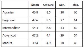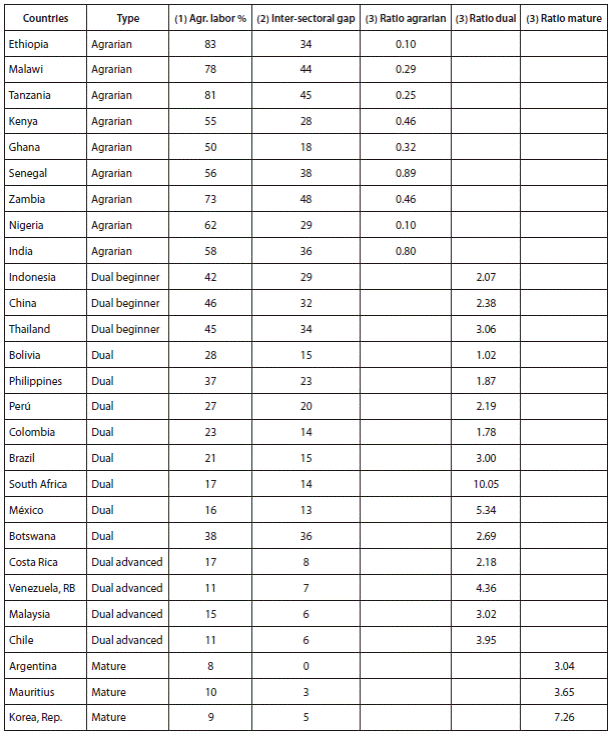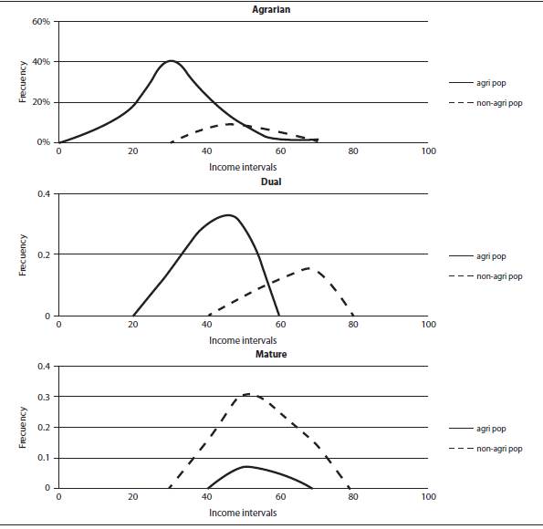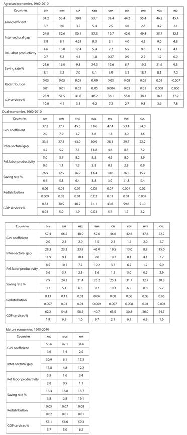 We aim to use a typology that fits the phases proposed by Kuznets regarding the evolution of income distribution over time. On this line, Fei and Ranis (1966) suggest that countries can be divided into three groups: agrarian, dual and economically mature. A country can be described as agrarian when agriculture is the dominating sector of the economy, industry is insipient and the productivity of service activities is low. In this group, the average income and inequality are expected to be low. However, data from contemporary developing countries indicate that although the average income is likely to be low, the variance of the total income distribution is not. One reason is that labor is mostly employed in agriculture and many of the laborers live in extreme poverty.