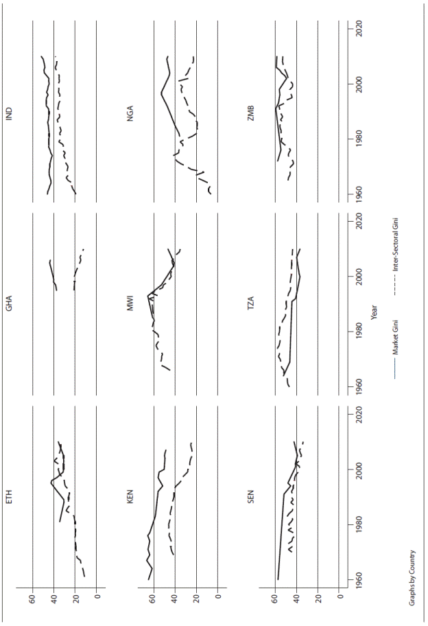 When the two terms are of a similar size, the inter-sectoral gap indicates that the transition is complete. We use data from the Groningen Growth and Development Centre Data (GGDC) on sectoral value-added and employment4 for the period 1960-2010. We expect the relationship between the inter-sectoral productivity gap and income inequality to be positive. For instance, the Gini coefficient of China and India shows a clear upward trend in tandem with the inter-sectoral gap (see Figures 2 and 3 in the appendix).