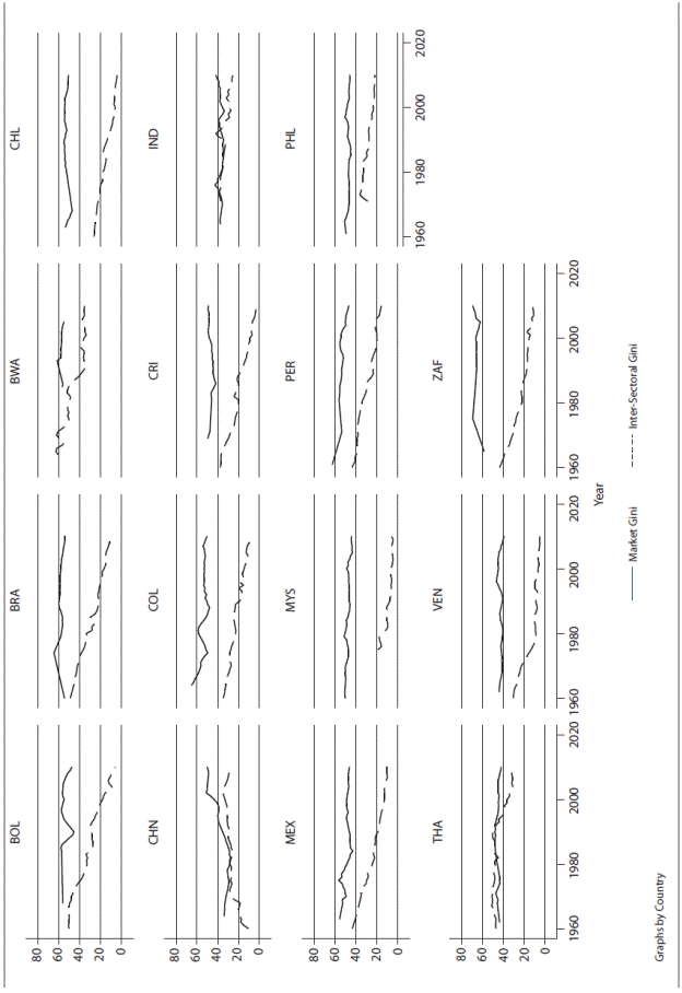 The developing world has achieved robust growth in the last decade. On average, countries in Asia, Latin America and Africa have been growing faster than their counterparts in the developed world, and the prospects for catching up seem to have improved in many countries (Subramanian and Kessler, 2013). Global poverty has declined, with China at the forefront, and the Millennium Development Goals and their successors - the Sustainable Development Goals - appear to have sent the right policy message to maintain the global efforts toward building more prosperous societies (Sachs, 2012). However, the recent growth period, with the exception of that in Latin America (Lustig et al., 2013), is associated with rising income inequality. Most countries in Asia and Africa seem to be experiencing the growth-equality trade-off (Kanbur et al., 2014; Thorbecke and Ouyang, 2016). For these reasons, the concern for inequality has reached policymakers, academics, journalists and citizens, making the case that rising inequality dampens the possibility for economic growth to be sustained and harms the political climate. Concerns have also been raised regarding the nature of the recent growth spell and the extent to which it has been inclusive and stimulated structural change or mostly rewarded a particular group or sector of the economy. In this context, this paper deploys a structural change perspective emphasizing the long-term changes in the sectoral composition of developing economies to examine the development of income inequality in developing countries categorized according to their degree of dualism. This is measured by the inter-sectoral gap, which is the difference in average labor productivity between agriculture and non-agriculture.