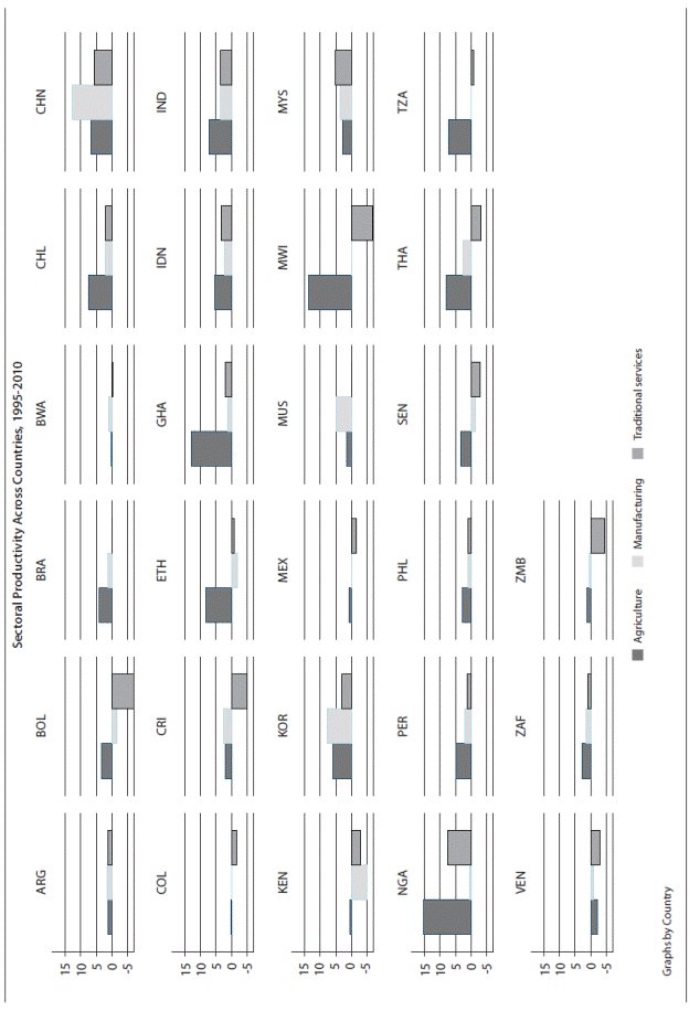 Apart from the role of agriculture in development, we have to determine whether other forces play any role in the behavior of income inequality. The service sector has indeed become the main employer, a clear sign of structural change, and can contribute to the overall productivity, albeit in different ways (Ravallion and Chen, 2007; McMillan and Rodrik, 2011; Ghani and ODonell, 2014). We find that the traditional service sector provided a negative contribution to the overall productivity in the agrarian economies of Africa, in three dual economies of Latin America (Bolivia, Colombia and Costa Rica) and in one in Asia (Thailand). India is the only economy among the agrarian group in which the traditional service sector made a positive contribution to the overall productivity growth, even though inequality rose from 0.32 to 0.37 Gini points. The rising inequality in India may be partly driven by the modern service sector (Mazundar, 2010).