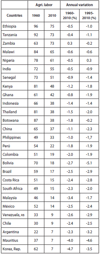 Structural change consists of the long-term changes in the composition of output and employment in the economy, with implications for income distribution (Kuznets and Murphy, 1966; Timmer, 1988, 2007). One of the major structural changes in the second half of the twentieth century was the reallocation of agricultural labor in the developing world, particularly in Southeast Asia and Latin America (Ocampo et al., 2009). In the last decade, the share of agricultural labor in Africa has also declined by almost 10%, and this is one of the main explanations for its recent spurt of growth (McMillan and Harttgen, 2014). However, the reallocation of labor to other sectors is not complete, and surplus labor remains the main feature of developing economies.