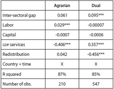 After finding empirical support for some sort of agricultural catch-up, we attempt to estimate whether improvements in the inter-sectoral gap lead to a lower level of income inequality. In table 4, the inter-sectoral gap has a positive association with the Gini coefficient in agrarian and dual economies. The beta coefficient, however, is negligible: an increase of 1% raises the Gini by less than 0.10%.