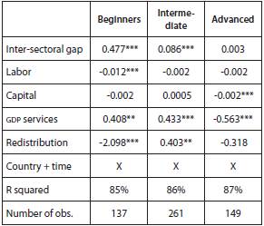 After disaggregating the dual economies, table 5 indicates that a 1% increase in the inter-sectoral gap raises the overall Gini by 0.47% among the beginners. It is clear then that the growth rate at which the inter-sectoral gap narrows (or increases) matters for income inequality. In contrast, the effect is less than 0.1% among the intermediate economies and disappears completely among the advanced economies.