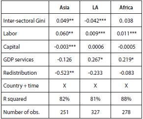 Finally, in table 6, we check that the typology is useful for clustering such a heterogeneous group of countries at different stages of the inter-sectoral ladder. The inter-sectoral gap also has a positive relationship with the Gini, but the effect cancels out over the period. On average, an increase of 1% in the inter-sectoral Gini raises income inequality by 0.05% in Asia. The effect is 0.04% in Africa. In Latin America, the effect has the wrong, albeit statistically significant, direction. Taking out Argentina, which is the only country with no inter-sectoral gap, the effect is close to 0.03% but not significant at the 10% level. The implication is that the effect of the inter-sectoral gap on income distribution in the developing world is more a matter of structural characteristics than geographical location.