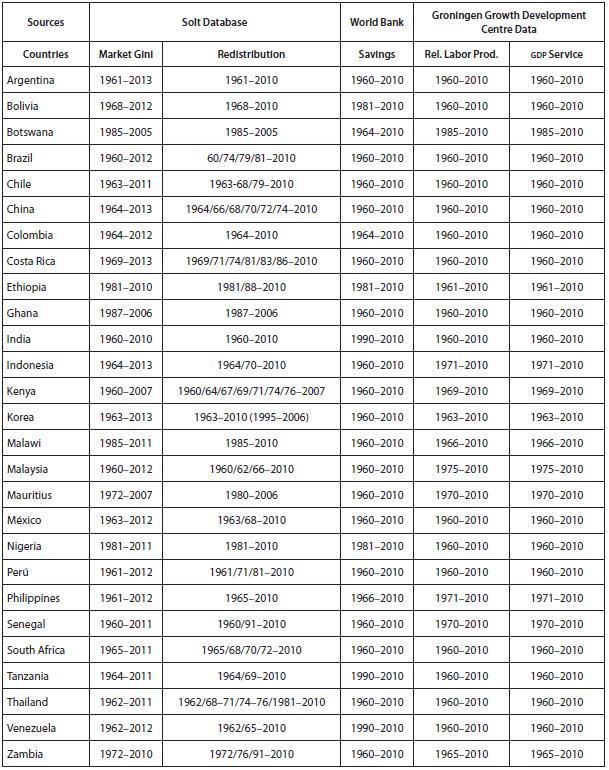 For the controls in equation (1), we put together a simple structural model of income inequality, which accounts for capital, labor and unearned income. (i) Capital income refers to the distribution and changes in value assets or wealth over time. They should be studied jointly with the income Gini because the distribution of wealth is the result of past income distributions and savings rates. We obtain the data for savings from the World Bank Indicators. (ii) Labor income is the reward for work. Assuming that labor productivity and wages are mutually connected, increases in labor productivity can raise the level of income inequality. Likewise, we add the impact of the service GDP to the Gini coefficient because the traditional or informal service sectors absorb most of the labor. (iii) Unearned income is the product of transfers, which are not in exchange for goods or services. Here governments can mitigate rising inequality within countries through the imposition of progressive income taxes and the funding of social programs. Thus, we use the difference between market and net inequality to capture redistribution throughout the whole period. The period 1995-2010 is the most complete in terms of data availability for all countries, in particular African countries. Tables B and C in the appendix provide the descriptive statistics and data availability.