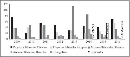 En la actualidad, no parece haber duda de que la fuente de información más estandarizada que existe en la región sobre CSS es el Informe de la Segib publicado anualmente, aunque con cifras de dos años atrás; sin embargo, es a la fecha un buen termómetro de la CSS Iberoamericana. Contiene información cada vez más precisa y especializada sobre CSS bilateral, regional y triangular (Prado, 2016). El panorama reciente del caso colombiano se aprecia en la Figura 1.