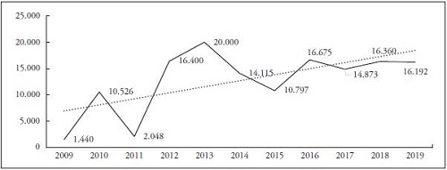 Adicionalmente, según los informes publicados por APC-Colombia, el país sostenía relaciones de CSS con menos de 40 países hacia el 2009, alcanzando en 2015 una cifra superior a los 70 (debido a su CSS con Asia y África), y en 2017 reportó CSS con un total de 66 países (APC-Colombia, 2018). En términos financieros la CSS que realiza el país a través de su agencia de cooperación, registra un monto cercano a los COP$140.000 millones en el período 2009-2019 (ver Figura 2).