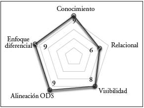 Al finalizar la iniciativa, las entidades técnicas ejecutoras junto a las respectivas agencias de cooperación, o quien haga sus veces en los países involucrados, asignarán una valoración final para cada uno de los indicadores de forma que cada categoría pueda alcanzar un puntaje que variará entre 0-9. Esta valoración debe encontrarse soportada con las evidencias técnicas que demuestren realmente los logros en términos de desarrollo alcanzados por la iniciativa implementada. La agregación de valor, dada su complejidad en términos de variables, momentos, puntajes, se representa visualmente mediante un gráfico radial, como se verá en el siguiente apartado (ver Figura 3).