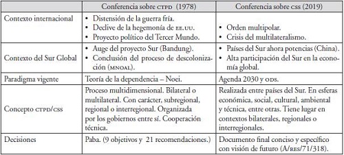 Es innegable que la cooperación entre países en desarrollo, discutida en marzo de 2019, dista mucho de la cooperación moldeada en septiembre de 1978. El contexto internacional y del mundo en desarrollo ha cambiado profundamente. No obstante, cuestiones fundacionales como el interés por contar con información confiable sobre la CSS se mantienen vigentes luego de cuarenta años (ver Tabla 1). De allí que a lo largo de estas décadas algunas regiones y países del Sur, incluido ahora Colombia, hayan decidido iniciar la implementación de acciones principalmente gubernamentales al respecto.