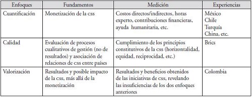 El primero de ellos, es el nivel de las experiencias nacionales de países como Brasil, Colombia, Turquía o Emiratos Árabes que generan y reportan información cuantitativa y cualitativa. Un segundo nivel, son las experiencias regionales como el caso de la Segib con el Informe de la CSS ya mencionado, y la Cepal en la definición de una metodología para medir la CSS; y por último, las experiencias internacionales como la del Network of Southern Think Tanks (NesT) que propone criterios, métodos e indicadores de medición de la CSS asociados al segundo enfoque de evaluación de procesos arriba indicado.