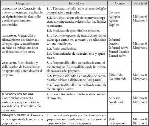 En segunda instancia, el concepto novedoso que incorpora el MCAV es el de la agregación de valor, como el elemento a través del cual el país busca valorar las contribuciones que efectivamente realizan las iniciativas de CSS en el desarrollo del país y de los países socios con los que se implementa. Para tales efectos, este segundo componente de agregación de valor define cinco categorías con sus respectivos indicadores y alcance esperado, en los cuales se busca establecer cómo la implementación de iniciativas de CSS en realidad agrega valor y contribuye al desarrollo, en términos cualitativos más que monetarios (ver Tabla 3).