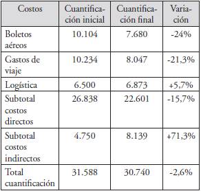Considerando un ejemplo sencillo en donde un funcionario colombiano se desplazara a Bolivia a desarrollar una agenda técnica, de 5 días de duración y APC-Colombia financiara su boleto aéreo a un costo de US$2.000, en tanto que el Gobierno de Bolivia aportara los viáticos para el delegado a US$80 diarios. Los costos directos serían calculados de la siguiente forma: