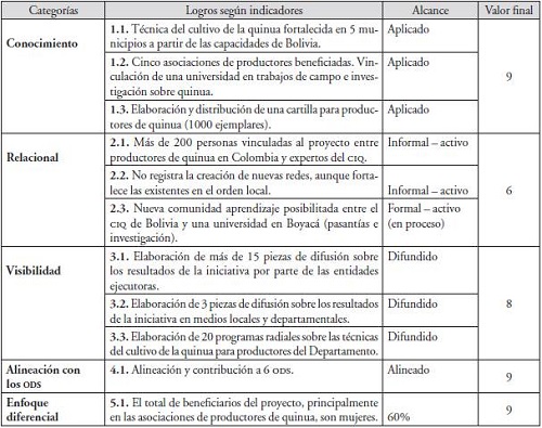 El proyecto de CSS en mención ejecutó cinco misiones de intercambio en Bolivia y Colombia, junto a jornadas de trabajo virtuales entre el CIQ, la Gobernación de Boyacá y directamente representantes de cuatro asociaciones de productores de quinua del citado departamento colombiano. Una vez concluida la ejecución de la iniciativa bilateral y realizado el ejercicio de cuantificación (ver Tabla 4) y agregación de valor (ver Tabla 5) con la participación de las entidades técnicas ejecutoras y las entidades responsables de la CSS de ambos países, se muestran los resultados del ejercicio técnico:
