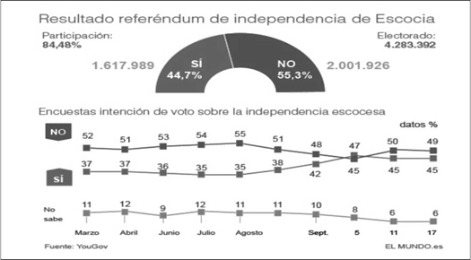Por otro lado, inmediatamente después de haber tomado el poder David Cameron enfrentó retos de suma importancia, como la eventual separación de Escocia, en el marco del referéndum que se llevó a cabo el 18 de septiembre de 2014. El movimiento político Yes Scotland'(Sí Escocia) promovió la independencia de Escocia y la agrupación Better Together rechazó la independencia. Finalmente, como se puede apreciar en la Gráfica 2, el "no" por la independencia se impuso con el 55,3% de los votos, frente al 44, 7% de los partidarios por la independencia (Boix, 2012).