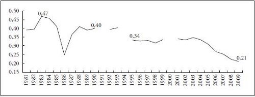 Poverty in Brazil has been a main feature of its economic development during the second half of the 20th century (see figure 1). More than half of the population lived in poverty until the mid-1980s, which coincides with the end of the military rule. Military rule, which lasted from 1964 to 1985, produced no significant improvements in the income distribution (Graham, Gauthier & de Barros, 1987). The transition into democracy began with President Sarney between 1985 and 1989 and came along with structural economic adjustments to an economy overwhelmed in high inflation and unemployment (Reis, 2014).