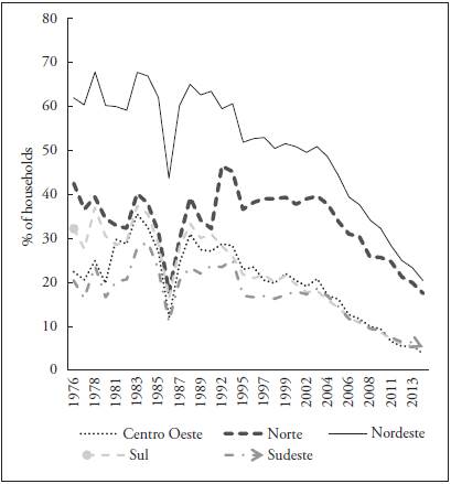 Sectoral economic growth is indeed central to explain the reduction of poverty, but we also know about how uneven growth can be at the regional level (Loayza & Raddatz, 2010). Some regions grow faster than others do, and the differences may support the persistency of income gaps within a country. Brazil is indeed a good example of different levels of development within a country. For instance, the Northeast region is less developed than the southern regions. The relative backwardness of the Northeast region has been on the government agenda since the late 19th and has persisted during the 20th century, but with little success (De Vreyer & Spielvogel, 2005). Not surprisingly, the poverty level in the Northeast was three times that of the southern regions in 2000 (see figure 3).