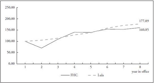 During Cardoso's term, the state and municipal expenditures grew at a rate of 7% per year, which is 1.5 percentage points below that during Lula Da Silva's term (figure 4). The macroeconomic stabilization during Cardoso's term came in tandem with condition-based social programs aimed at investing in education and food and gas for the bottom of the population between 1999 and 2002. First, the Bolsa Escola (School Allowance) was a conditional cash transfer program that provided financial assistance to low-income families for sending their children to school instead of using them as labor. Second, the Bolsa Alimentação (Food Allowance) and Auxílio Gás (Cooking Gas Assistance) were aimed at increasing food security of low-income families. Unlike the other two, the Auxílio Gás, was a cash transfer without formal conditions. It was a small payment for each family whose income was below half a minimum wage per capita for the acquisition of gas cylinders for cooking purposes. The program came from the understanding that malnourishment was not related to food scarcity but of means to cook the food properly. These three social programs merged into one during Lula da Silva's administration and were unified under the label Bolsa Família. As one single program, Lula's administration expanded its coverage: over 13 million families, or 47 million individuals, were registered in 2013.