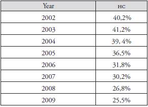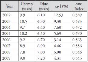 As Table 5 shows below, unemployment rates have reached its record low on 2008, despite some inconsistent trend. Average educational level shows a consistent upwards trend while the Gini index demonstrates that inequality is decreasing considerable throughout the period. The inflation rate, even though above the upper inflation target set by the Brazilian Central Bank of6.5% - with the lower bracket set on 2,5% - on the years of 2002, 2003 and 2004 have maintained a downward trajectory and from 2004 and beyond have consistently stayed between the target limits, reaching its record low on 2006.