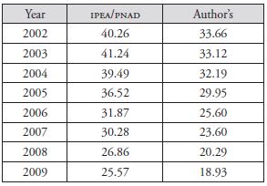 Due to its lower caloric threshold, IPEA'S headcount index is systematically higher than the index calculated by the present author. Despite these differences, the trend is the same, with consistent reduction year over year. Another difference between the indexes is the deflator. While the present author deflated the series geographically according to Ferreira et al. (2003) regional deflator index - that, in turn, was derived from the Survey of Living Standards from 1996/1997 - IPEA'S series were geographically deflated according to Household Budget Survey (POF).