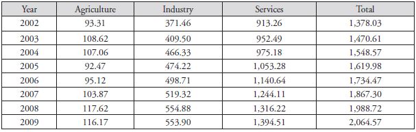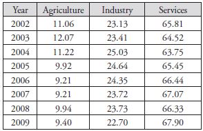 The Service sector is clearly the most important component of the Brazilian GDP. Nonetheless, the aforementioned sector is the one that grew the most during the period, accumulating 53% of growth from 2002-2009. While the industry sector have also provided a consistent upward trend through the period, its importance to the aggregated GDP is more modest. Agriculture is the sector that presented the most inconsistent trend, though it had accumulated 24% of growth during the period. The volatility for this specific sector is expected once it is acknowledged that Brazil is a strong player in the global food market and, therefore, is more susceptible to shocks from commodities' prices.