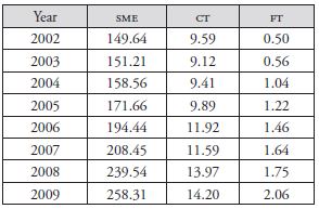 It was already presented in subsection 5.2.2 that Brazilian's economic activity have consistently grown during 2002 to 2009, therefore, it is natural that the same phenomena is verified on government expenditures, which usually corresponds to a fixed proportion of the GDP. However, it is important to note the sudden increase on FT after 2004 representing the Bolsa Família program. Despite this increase, the FT is still considerably lower when compared to CT and SME.