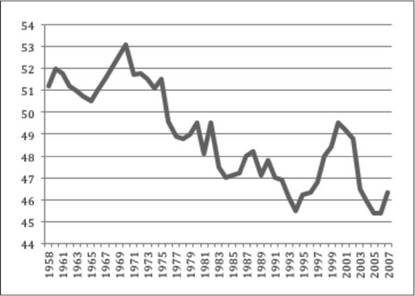 Por otro lado, el estancamiento de la economía estadounidense y la explosión de las finanzas incidieron en el deterioro de las condiciones laborales y los salarios de los estadounidenses. A partir de los años setenta, a causa de la ralentización económica, el capital, con el fin de aumentar sus beneficios, inició una lucha contra los trabajadores presionando a las administraciones demócratas y republicanas para reducir los costes laborales, lo que condujo a un aumento en las desigualdades y desmejoró la redistribución de la riqueza (Bellamy & Magdoff, 2009). El Gráfico 1 refleja la participación de los salarios en el PIB entre los años setenta y dos mil cinco, lo que significa que "en EE.UU. los salarios reales de los trabajadores privados no agricultores (en dólares de 1982) alcanzaron su punto máximo en 1972 con 8,99 dólares por hora y en 2006 ya habían caído a 8,24 dólares (equivalentes a la tasa de salario real por hora de 1967)" (Bellamy & Magdoff, 2009, p. 185).