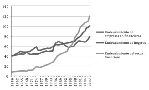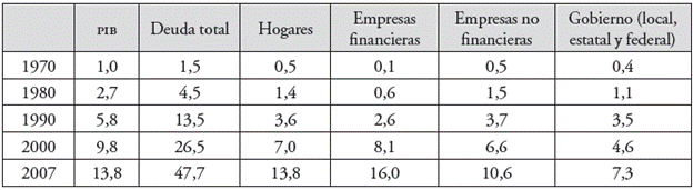 Ante el estancamiento de la economía real y la caída de los salarios de los trabajadores, el capital decidió apalancar su salida al problema expandiendo la deuda tanto en las empresas no financieras como financieras, en los hogares y en todos los niveles del gobierno, obteniendo así beneficios especulativos y una explosión financiera. En la Tabla 2 y la Gráfica 2, se puede evidenciar, de manera clara, como a partir de 1970 hasta el 2007, un año antes de la crisis financiera, las empresas, el sector financiero, los hogares y el gobierno se endeudaron de manera considerable aun con una economía real que no tenía la capacidad para respaldar tal endeudamiento.