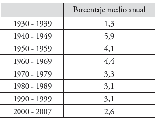 El estancamiento creciente de la economía real, antes mencionado, se evidencia con la Tabla 1 que muestra cómo el crecimiento del Producto Interno Bruto (PIB) real de los Estados Unidos entre 1930 y 2007 se reduce. Los datos de la Tabla demuestran que para los años treinta la Gran Depresión afectó, de manera considerable, la economía estadounidense, seguido del extraordinario crecimiento de los años cuarenta que se atribuyen al impacto de la segunda guerra mundial y la "era dorada" entre los años cincuenta y setenta, en la que la economía creció en tiempo de paz. Sin embargo, es a partir de 1980 que las tasas de crecimiento se reducen y la baja expansión de la economía se convierte en tendencia.