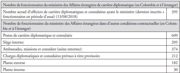 Cela peut co'íncider avec la difficulté à trouver des informations officielles et suffisamment fiables sur le sujet. C'est pour cette raison qu'il a été demandé à la Direction des ressources humaines du ministère des Affaires étrangères (MAE) de mettre à jour les chiffres des responsables des MAE parmi les diplomates de carrière et ceux qui sont soumis à un autre type de contrat. À la date de livraison définitive de cet article, aucune information de ce type n'a été reçue. Cependant, la réponse de l'Association diplomatique et consulaire colombienne a été très diligente et nous a fait part des informations suivantes (Tableau 1):