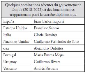 Les trois variables ci-dessus ne sauraient être liées à un agent particulier. Ce n'est pas un problème des présidents Betancur, Gaviria, Samper, Pastrana, Uribe ou Santos. Un mois après la prise de possession du président Duque, le tableau suivant suggère quelques cas de fonctionnaires n'appartenant pas à la carrière diplomatique (Tableau 2):