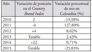 Por último, si bien Colombia obtuvo una escala progresiva en el Country Brand Index en los años 2010 al 2015, es importante resaltar que son varios retos para poder obtener una posición en los primeros lugares de este indicador a nivel de Latinoamérica, ya que no se puede afirmar que tanto la Marca Colombia como la IED son variables dependientes, al no evidenciar una relación directamente proporcional en las variaciones presentadas, puesto que la IED se ve influenciada por más factores externos e internos como son las políticas económicas y sociales.