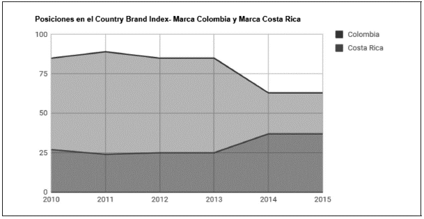Por otra parte, resulta de gran relevancia mencionar los resultados que ha tenido la Marca Colombia durante este período, según el indicador: Country Brand Index, que clasifica la posición de marcas país a nivel mundial, analizando 110 países en factores como: gobernanza, clima de inversión, calidad de vida, cultura y turismo (Future Brand, 2013), en este sentido las marcas país que se destaquen más en estos factores analizados, tendrán las primeras posiciones dentro del ranking. Marca Colombia en el 2010 ocupó el puesto 85, en el 2011 el 89, en 2012-2013 el 85 y en el 2014-2015 el 63.