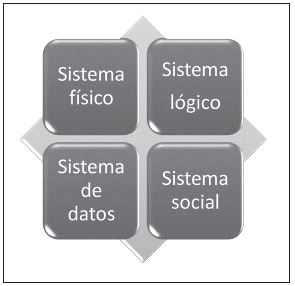 En la siguiente figura se puede observar, de forma esquemática, cómo se configuran los distintos sistemas que componen el ciberespacio. Se elige esta figura, pues se considera que la complementariedad y retroalimentación entre los cuatro bloques es indispensable para el buen desempeño de este. Si bien es cierto que en este trabajo de investigación el énfasis se pone en los últimos dos bloques, no se pierde de vista la aportación y el ejercicio que ejercen los primeros dos, pues son imprescindibles para entender la complejidad de las interacciones cibernéticas internacionales.