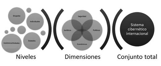 Con base en esto, se puede inferir que en el ciberespacio los actores son diversos, con diferentes grados de poder y capacidades, organización e infraestructura, lo cual hace al análisis mayormente desafiante. Esto acentúa más la necesidad de mover el debate de las relaciones cibernéticas hacia las bases del estudio de la política internacional (Valeriano & Maness, 2015). Para algunos expertos, los problemas cibernéticos internacionales no están desprovistos de los procesos de las relaciones internacionales cinéticas, por ello pueden brindar claves para su estudio sistemático, holístico y heurístico (Dunn Cavelty, 2008b). En el siguiente cuadro se presenta una propuesta de análisis para entender la conformación del Sistema Internacional Cibernético.