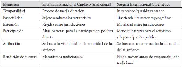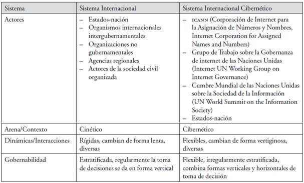 Para algunos autores como David D. Clark (2010) la cualidad distintiva reside en que los sistemas de decisión del ciberespacio están involucrando una tremenda gama de actores y entidades en la operación de este. En el nivel más general, incluye a los agentes de la industria de internet e informática, aquellos involucrados en aplicaciones y desarrollo de software, proveedores de contenido, gobiernos, organizaciones internacionales, gerentes de espacios en la red, organizaciones no gubernamentales y, lo más importante, una gran amalgama de grupos e individuos a lo largo del orbe. En el siguiente cuadro, se pueden ejemplificar, de manera sencilla, algunas de las diferencias entre el sistema internacional tradicional y el cibernético.