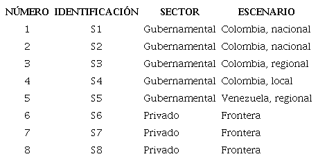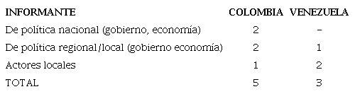 Se partió de una estimación de diez informantes, que se fue elevando, en parte, con la utilización del muestreo en cadena (Hernández, Fernández y Baptista, 2014), y en parte, por la negativa de informantes a aportar información que consideraron sensitiva y que les generaba temores de correr riesgos importantes. El número de informantes contactados se elevó a 50, y a partir de allí se eliminó a quienes reusaban profundizar y aportar información relevante o de calidad. Ello contribuyó a que el tiempo estimado para realizar el trabajo se extendiera significativamente. Se buscó entrevistar a las autoridades nacionales, regionales y locales de cada país; y a los grupos sociales más relevantes de la frontera (comerciantes, industriales y profesionales) con el fin de obtener la información que permitiera lograr los objetivos.