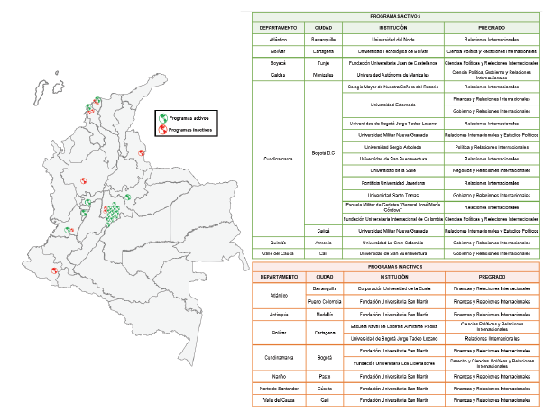 Al mirar la distribución geográfica de los programas de pregrado en relaciones internacionales en Colombia, se aprecia claramente una concentración de programas en la región andina (departamentos de Boyacá, Caldas, Cundinamarca, Quindío y Valle del Cauca) con un total de 17 programas activos y 6 inactivos. En contraste con la región Caribe (departamentos de Atlántico y Bolívar) con 2 programas activos y 4 inactivos (ver Mapa 1). Es importante destacar que regiones como la Orinoquía, Amazonía, Pacífico e insular no cuentan con oferta de programas en pregrado en relaciones internacionales.