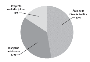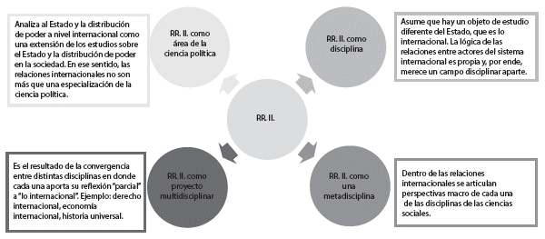 Finalmente, no puede desconocerse que, como lo menciona Merke (2005), la institucionalización de las relaciones internacionales implica, necesariamente, considerar si se trata de una disciplina autónoma, un área de la ciencia política, un proyecto multidisciplinario o una "meta-disciplina" (ver figura 1). Esto no solo importa dentro de las proposiciones ontológicas y epistemológicas acerca de la disciplina, sino que tiene efectos prácticos en los programas de formación (el énfasis en la teoría, en los métodos y en los alcances varía de acuerdo con este punto de partida), por lo que vale la pena tenerlo en cuenta cuando se analicen los programas de pregrado en Colombia.