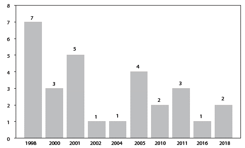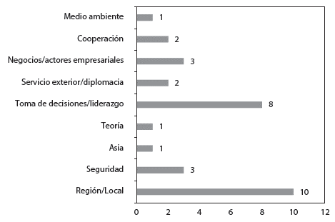 La figura 7 cuantifica las ideas clave que se identificaron en los programas analizados. Se puede observar que la idea de actuación regional o local es la que más aparece, seguida por la toma de decisiones. El resto solo aparece esporádicamente y no logran ser una constante. En ese sentido, puede afirmarse que los programas de relaciones internacionales tienen una propensión por tomar acciones que impacten a nivel local, lo que debería considerarse importante en una disciplina que, por sus unidades de análisis, puede ser acusada de estar alejada de las dinámicas nacionales y locales.