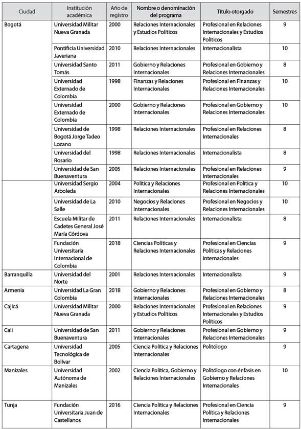 Posteriormente, otras instituciones ofrecieron el pregrado en relaciones internacionales: Universidad Militar Nueva Granada -sede Bogotá (2000) y Cajicá (2000)-; Universidad Externado (2000)14; Universidad del Norte (2001); Universidad Autónoma de Manizales (2002); Universidad Sergio Arboleda (2004); Universidad de San Buenaventura- sede Bogotá (2005); Universidad Tecnológica de Bolívar (2005); Universidad de la Salle (2010); Pontificia Universidad Javeriana(2010); Universidad Santo Tomas (2011); Universidad de San Buenaventura-sede Cali (2011); Escuela Militar de Cadetes "General José María Córdova" (2011); Fundación Universitaria Juan de Castellanos (2016); Universidad la Gran Colombia (2018); Fundación Universitaria Internacional de Colombia (2018).