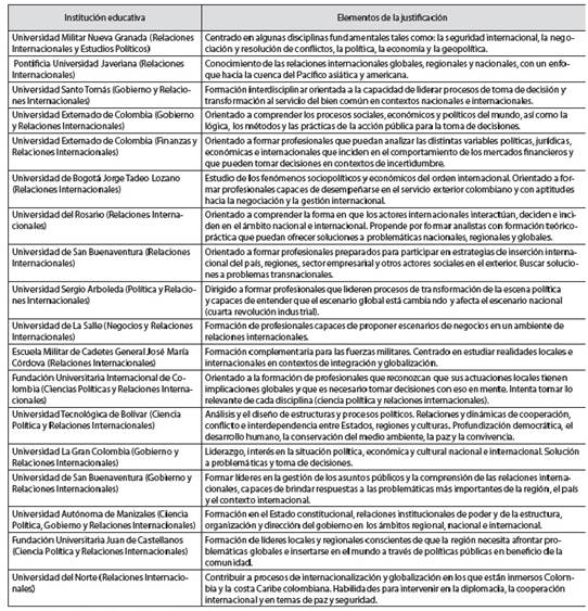 En segundo lugar, intentamos encontrar en las justificaciones de las universidades posiciones frente a las relaciones internacionales y los supuestos que subyacen su oferta: se enseña la disciplina de una manera porque en su matriz de origen hay también visiones sobre su utilidad. Finalmente, porque las universidades se obligan a cumplir con un programa de estudios y están vigiladas por el Ministerio de Educación Nacional en ese sentido, por lo que asumimos que no pueden diferir radicalmente de lo que ofrecen.