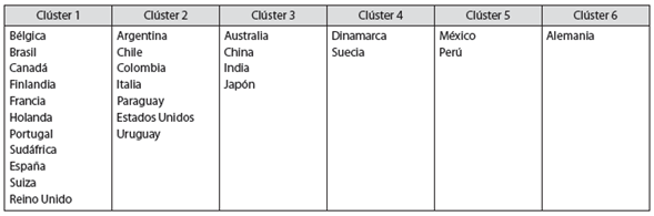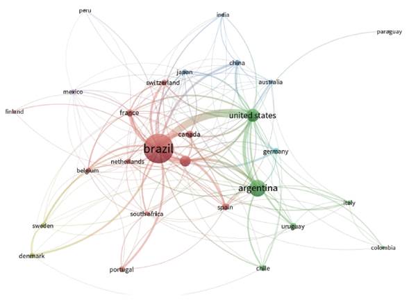 El mapa de la red muestra que la colaboración de los investigadores de RI del Mercosur en la base de datos de documentos construida es, principalmente, con investigadores del "Norte" siguiendo lo descripto en la literatura presentada. La red se construye, como se explicó antes, en función de lafuerzadel enlace (conexión) representada por cadaclúster,como muestra laTabla 2. Brasil tiene una presencia abrumadora en la base de datos de documentos (representado en el tamaño relativo de su esfera) y la mayor parte de la colaboración brasileña es con Europa. En el caso de Argentina, representada en el segundoclúster,aunque tiene colaboraciones con otros países sudamericanos, tiene un vínculo más fuerte con los Estados Unidos (EE. UU.). Este análisis preliminar, construido con documentos de dos bases de datos indexadas de publicaciones, refuerza la hipótesis de que la colaboración del investigador en los documentos publicados en esas bases de datos se explica principalmente por sus vínculos con los países del "Norte", como ya se indicó. De forma más explícita, la CI de los autores del campo de RI en las bases indexadas no puede prescindir de los vínculos internacionales con investigadores del "Norte" a la hora de observar sus publicacionesmainstream. Mientras que la colaboración de Brasil está generalmente orientada a Europa, la de Argentina está orientada a los Estados Unidos. Por supuesto, aunque con menos fuerza, existen publicaciones en coautoría existentes entre los países del Mercosur2.