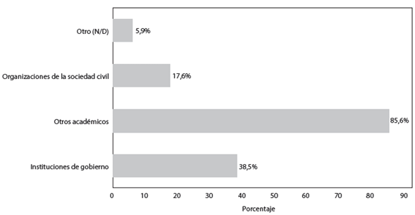 Como se dijo, los investigadoressénioresargumentan que ha habido un cambio con respecto al vínculo ciencia-política durante los últimos años, así como una práctica más reflexiva respecto de la transferencia de conocimiento. No hemos, durante este trabajo, profundizado más sobre las razones para este cambio. Sin embargo, la mayoría de ellos destacaron que los diálogos con la política, en sentido amplio, y los tomadores de decisión tienden a estar más influenciados por apertura y filiación política en el plano de las relaciones interpersonales. Los investigadores reconocen, en mayor medida, como los usuarios de su producción a la propia comunidad académica ya sea local, regional o internacional, como se muestra en laFigura 5.