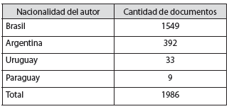 La primera etapa del estudio que presentamos se centró en el análisis cuantitativo de la producción científica para nuestro recorte empírico. Para el análisis, construimos una base de datos de documentos indexados en las bases Scopus (Elsevier) y WOS (Web of Science - Clarivate) de investigadores del campo de las RI del Mercosur entre 2000 y 2018. El proceso se realizó a través de la herramienta Scopus Analyzer y Clarivate Analytics con las que identificamos documentos con los términos de "relaciones internacionales" e "internacional relations" en el título, resumen, palabras clave y tema de investigación del autor, limitando los documentos resultantes a solo aquellos con al menos un autor en cada documento que declarase nacionalidad y lugar de trabajo en países del Mercosur (Argentina, Brasil, Paraguay y Uruguay). El resultado normalizado de la búsqueda fue de 1.986 documentos, distribuidos como se muestra en laTabla 1. Nuestro objetivo fue examinar más de cerca las publicaciones en CI (representados en coautorías) entre autores de países del Mercosur para identificar con quiénes están colaborando y presentar una red de la CI resultante.
