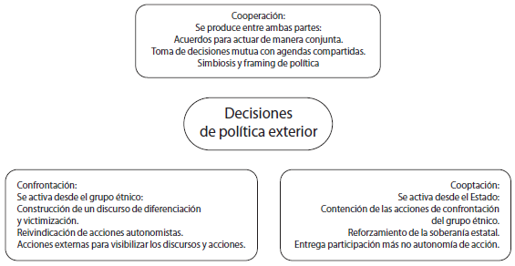 Cada uno de estos enfoques tiene en común señalar a los grupos étnicos como un factor doméstico importante en el momento de comprender aspectos de política exterior, pues dichos grupos cuentan con capacidad de agencia para producir cambios en las decisiones que los Estados toman para actuar en el ámbito externo o para resolver un asunto de interés para estos grupos. Empero, los enfoques posicionan a las etnias respecto al Estado de manera diferenciada en tres categorías que podríamos clasificar como confrontación, cooptación y cooperación. Estas tres categorías hacen del vínculo entre Estado y etnias una "relación estratégica" (Villar, 2003) que desemboca en una incidencia en la acción estatal.