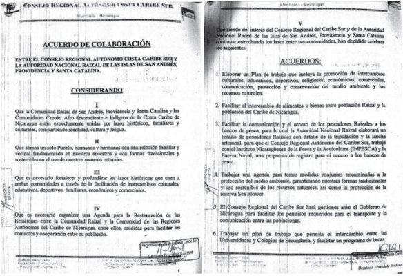 En 2014, tras la conmemoración de la "declaración de independencia raizal" realizada en 20075, Corine Duffis interpelaría en una carta al Estado colombiano, desdiciendo de su soberanía, de la falta de atención a los raizales e insistiría en el hecho de que "la pertenencia del territorio es del grupo étnico raizal [...] incluso antes de que Colombia existiera como Estado" ("Carta de Corine Duffis", 2014). La posterior visita a Nicaragua, que esta vez incluyó una reunión con el presidente Daniel Ortega ese mismo año, dejó como resultado un acuerdo de colaboración con asuntos culturales, económicos, deportivos, la cual reforzó los lazos entre las partes. Para Duffis, según lo que se presentó para el acuerdo "[en Nicaragua] nos aprobaron absolutamente todo (...) y al pasarlo al presidente [Daniel Ortega] estuvo totalmente de acuerdo con todo" (Duffis, comunicación personal, 29/08/2018). Esto fue visto como "el mayor acercamiento de la comunidad raizal a Nicaragua (...) era un claro desafío a la política oficial que, en efecto, cerró ese contacto o acercamiento entre dos comunidades hermanas, debido a políticas de soberanía" (Bush, comunicación personal, 03/08/2018).
