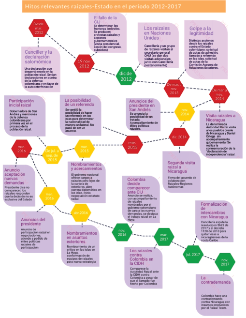 El período que se estudia aquí inicia en marzo de 2012 y termina en noviembre de 2017, período en el que se dio una relación raizales-Estado alrededor del diferendo limítrofe entre Colombia y Nicaragua, y que resulta ideal no solo para describir las acciones del grupo étnico como paradiplomacia, sino para establecer sus vínculos y efectos en la política exterior. La figura 1 reconstruye la línea temporal de los sucesos relevantes durante este período y se reconstruye a través de las voces de los involucrados y de la revisión de prensa local únicamente, ya que una historia detallada sobrepasa el propósito de este trabajo.