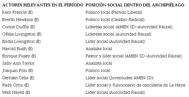 Este trabajo hará uso de esta clasificación para comprender la relación entre los raizales y el Estado colombiano, de cara a explicar la configuración de intereses y las acciones durante el período de análisis. Es importante clarificar la diversidad de intereses en el seno de la etnia raizal, pues allí conviven, por un lado, líderes de una élite política del bipartidismo colombiano (Partido Liberal y Partido Conservador) que ha ocupado cargos del nivel nacional (muchos de ellos en el ámbito de la política exterior); y, por otro lado, líderes comunitarios que en distintas coyunturas han edificado grupos de presión y movimientos sociales como Sons of the Soils (SOS), Archipelago Movement for Ethnic Native Self Determination (AMEN SD) y el Raizal Council, a través de los cuales se han organizado distintas acciones políticas de relevancia para la política exterior.